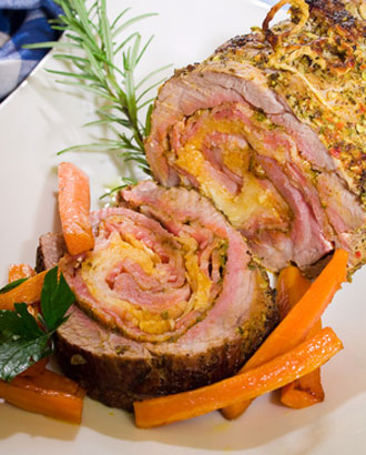 Spießbraten mit Mett und Zwiebeln gefüllt in Malzbiersauce